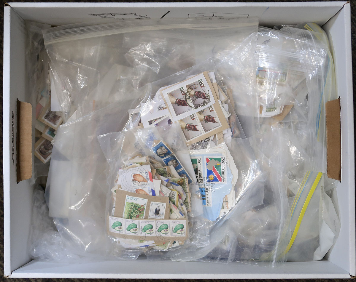 Africa and Fiji kiloware. About 10 lbs of "on & off" paper modern kiloware housed in a bankers box, sorted by country in baggies & glassines plus a bundle of duplicated souvenir sheets. Great potential! Estimate =
