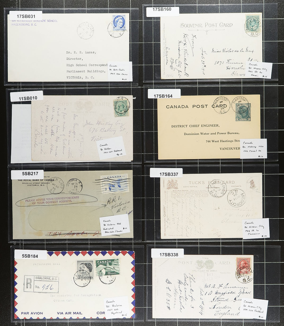 British Columbia Postal History. A selection of 24 CDS postmark covers and postcards, from Edward VII to QEII. A good selection of towns, spanning the province, including Bralorne, Glen Lake, Golden, Bella Coola, Mission City, Fawn, Barkerville, Mount Pleasant, Yale (Brit Col at bottom), Ladner, Knutsford, Muchalet etc. All are individually sleeved and priced. Total retail as marked =
