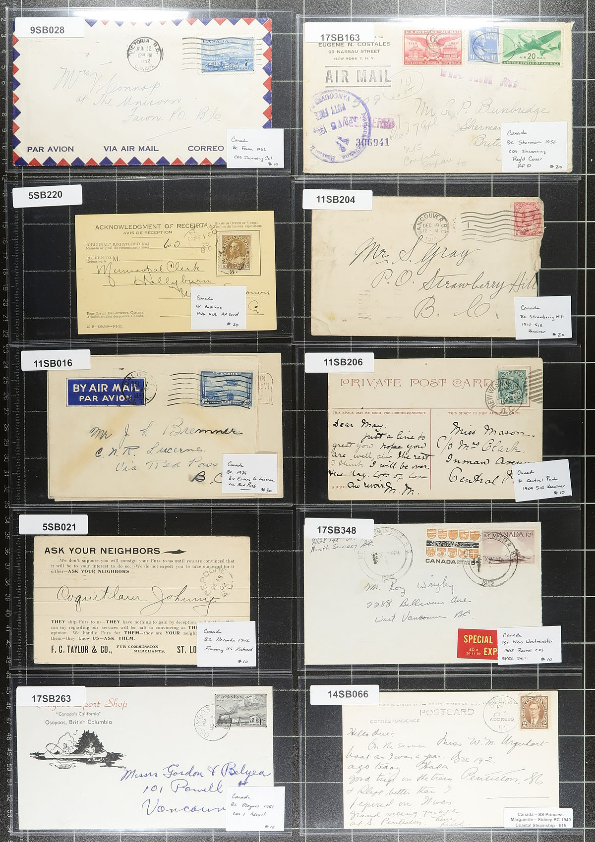 British Columbia Postal History. The great BC "catch all" postal history selection. A diverse large offering of 50 covers and postcards, all collected for either postmarks, usages, advertising etc, all from British Columbia. Take a good look at the photos to appreciate the lot. All items are individually sleeved and priced. Total retail as marked =