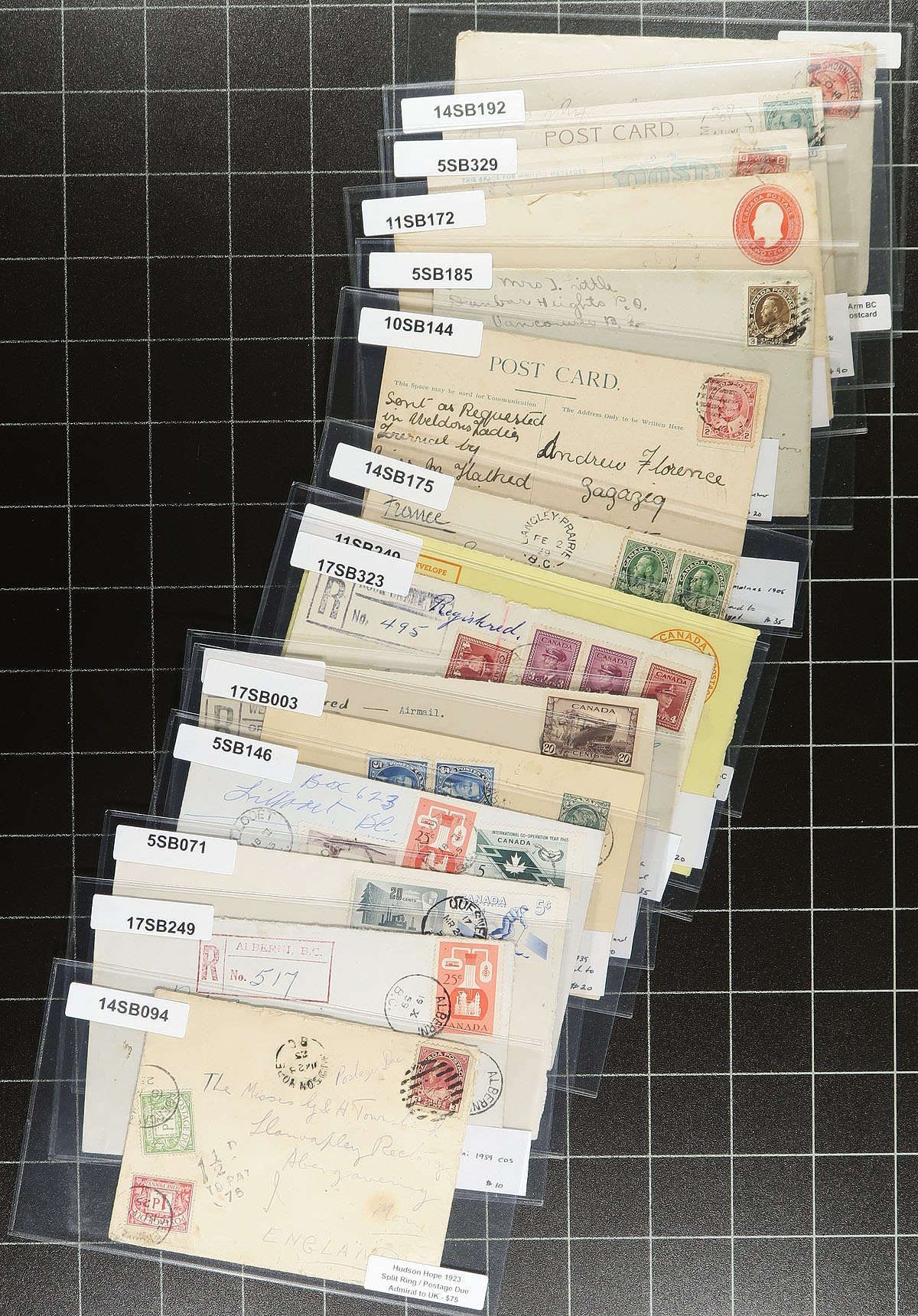 British Columbia Postal History. An "all better" selection of 15 better postmarks, usages and registered rate covers and postcards. Noted postmarks from Kerrisdale, Keating, North Lonsdale, Beaver Lake and Fraser Arm, along with several registered items (including a registered postcard), plus foreign destinations (like Chemainus 1905 Edward VII postcard to Egypt) and a nice cover posted from Hudson Hope 1925 to England, with British Postage Due stamps applied. All items are individually sleeved and priced. Total retail as marked =