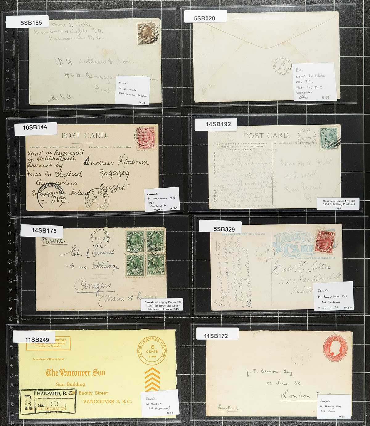 British Columbia Postal History. An "all better" selection of 15 better postmarks, usages and registered rate covers and postcards. Noted postmarks from Kerrisdale, Keating, North Lonsdale, Beaver Lake and Fraser Arm, along with several registered items (including a registered postcard), plus foreign destinations (like Chemainus 1905 Edward VII postcard to Egypt) and a nice cover posted from Hudson Hope 1925 to England, with British Postage Due stamps applied. All items are individually sleeved and priced. Total retail as marked =