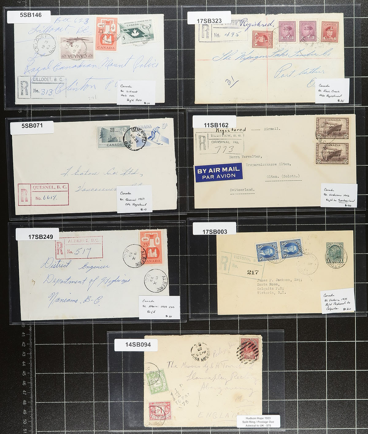 British Columbia Postal History. An "all better" selection of 15 better postmarks, usages and registered rate covers and postcards. Noted postmarks from Kerrisdale, Keating, North Lonsdale, Beaver Lake and Fraser Arm, along with several registered items (including a registered postcard), plus foreign destinations (like Chemainus 1905 Edward VII postcard to Egypt) and a nice cover posted from Hudson Hope 1925 to England, with British Postage Due stamps applied. All items are individually sleeved and priced. Total retail as marked =