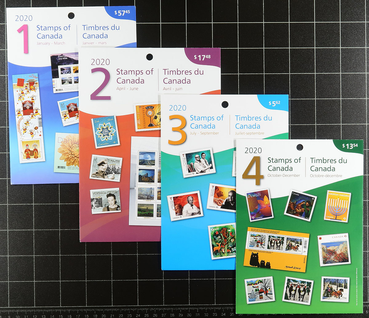 Quarterly Packs. Lot of Quarterly Packs complete for the year 2020 complete, all still sealed as received from the Post Office. These contain all of the issues for the year, including many sought-after die cut singles as well as blocks and souvenir sheets. These are now listed in Unitrade but not yet priced, conservatively grouped / counted by the original purchase price, which is lower than what is actually enclosed in the pack due to the increase in value of the Permanent stamps. This is likely one of the toughest to find groups of Quarterly Packs, issued at the onset of COVID-19. Original Canada Post cost =