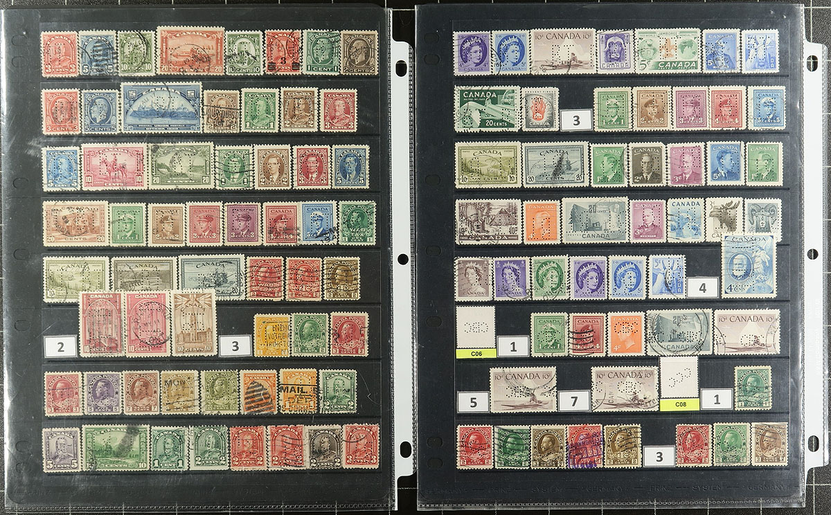 Collector's Holding of Insignia / Perfin ID numbers that range from B10/C27 with 18 different Perfin ID's, represented with 671 stamps, with a wide range of positions / issues. Neatly arranged on 12 pages and identified by The Perfin Handbook by the previous owner. The group comes with a detailed individual listing of each stamp, provided by the consignor. We have scanned in the summary page. The first of four Canadian Perfin lots from the same source, all offered in this sale. Estimate =
