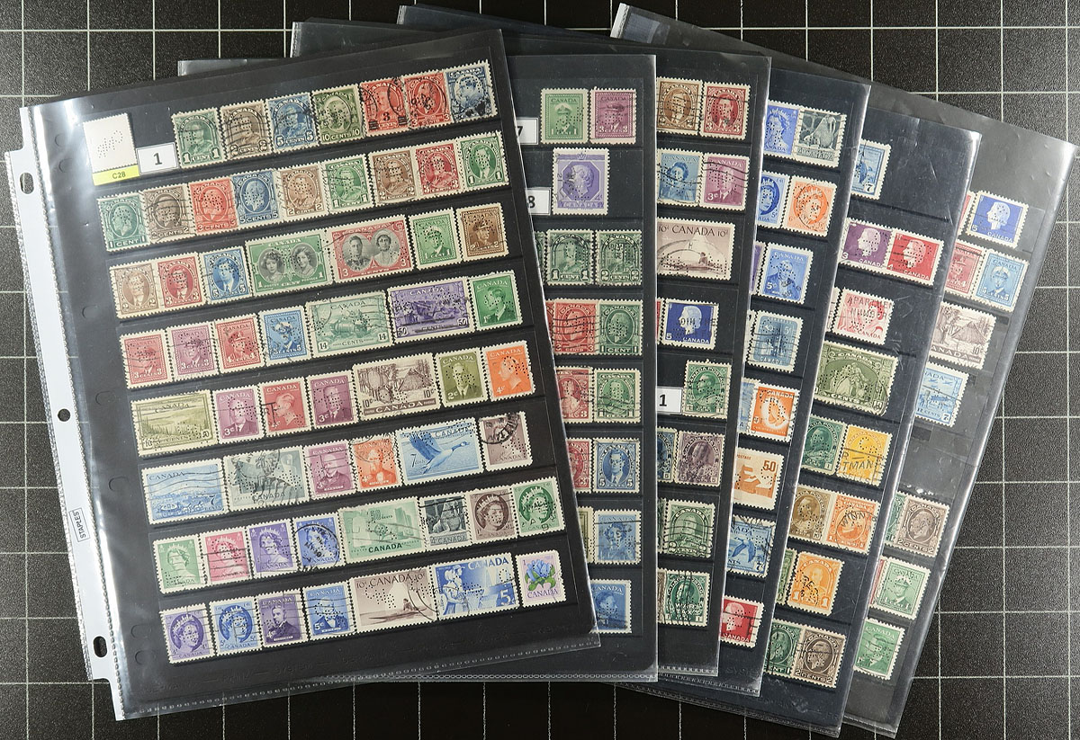 Collector's Holding of Insignia / Perfin ID numbers that range from C28, C29, C32-C36 (all CNR / CPR Railway insignia), represented with 685 stamps, with a wide range of positions / issues. Neatly arranged on 12 pages and identified by The Perfin Handbook by the previous owner. The group comes with a detailed individual listing of each stamp, provided by the consignor. We have scanned in the summary page. The second of four Canadian Perfin lots from the same source, all offered in this sale. Estimate =