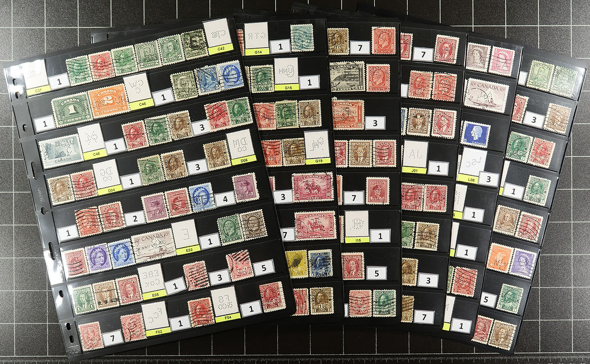 Collector's Holding of Insignia / Perfin ID numbers that range from C37/N17, with 55 different Perfin ID's, represented with 641 stamps, with a wide range of positions / issues. Neatly arranged on 12 pages and identified by The Perfin Handbook by the previous owner. The group comes with a detailed individual listing of each stamp, provided by the consignor. We have scanned in the summary page. The third of four Canadian Perfin lots from the same source, all offered in this sale. Estimate =