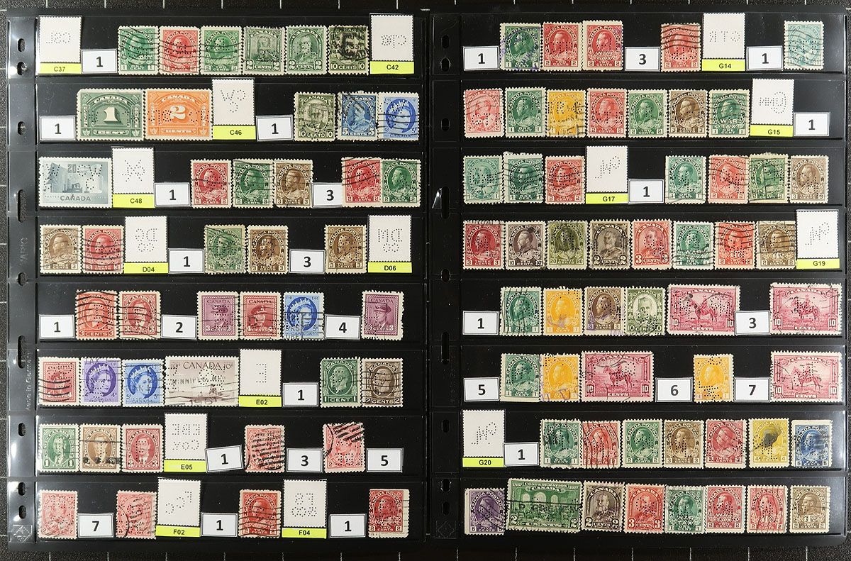 Collector's Holding of Insignia / Perfin ID numbers that range from C37/N17, with 55 different Perfin ID's, represented with 641 stamps, with a wide range of positions / issues. Neatly arranged on 12 pages and identified by The Perfin Handbook by the previous owner. The group comes with a detailed individual listing of each stamp, provided by the consignor. We have scanned in the summary page. The third of four Canadian Perfin lots from the same source, all offered in this sale. Estimate =