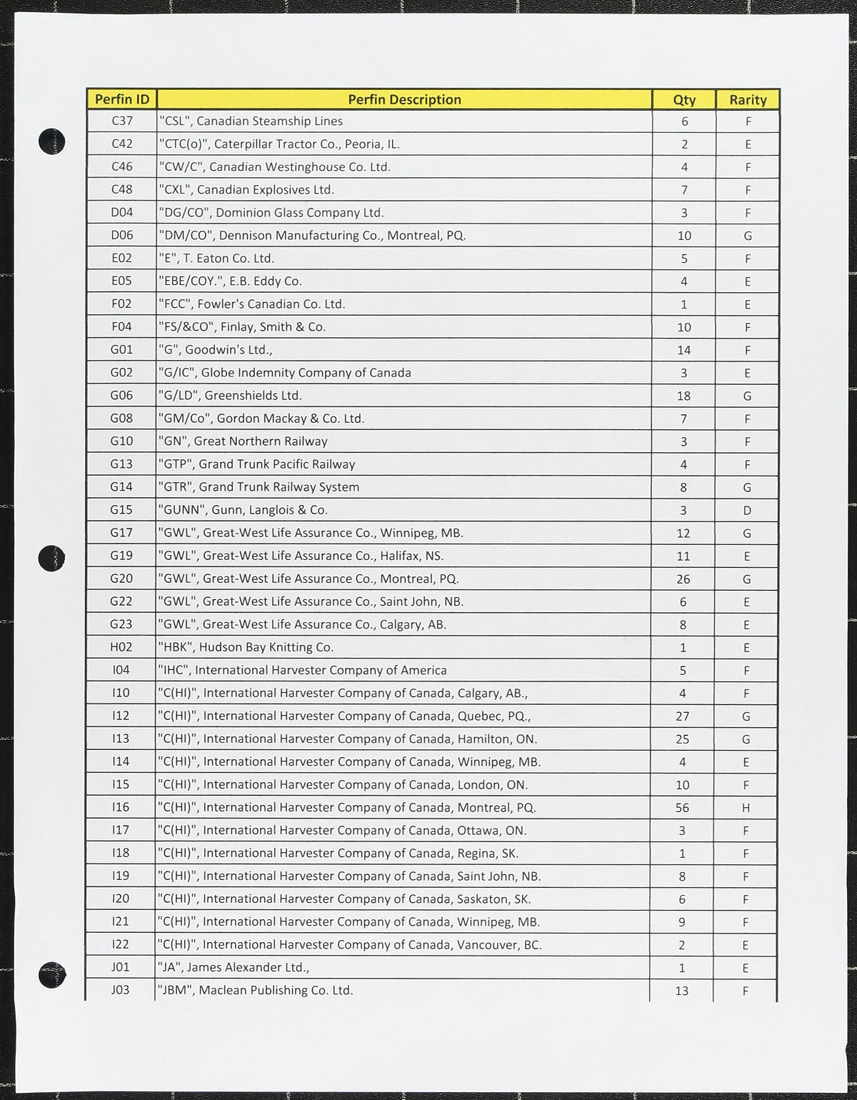 Collector's Holding of Insignia / Perfin ID numbers that range from C37/N17, with 55 different Perfin ID's, represented with 641 stamps, with a wide range of positions / issues. Neatly arranged on 12 pages and identified by The Perfin Handbook by the previous owner. The group comes with a detailed individual listing of each stamp, provided by the consignor. We have scanned in the summary page. The third of four Canadian Perfin lots from the same source, all offered in this sale. Estimate =