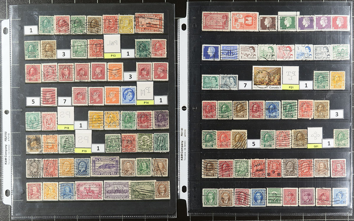 Collector's Holding of Insignia / Perfin ID numbers that range from N17/W13, with 44 different Perfin ID's, represented with 753 stamps, with a wide range of positions / issues. Neatly arranged on 15 pages and identified by The Perfin Handbook by the previous owner. The group comes with a detailed individual listing of each stamp, provided by the consignor. We have scanned in the summary page. The fourth and final Canadian Perfin lots from the same source, all offered in this sale. Estimate =