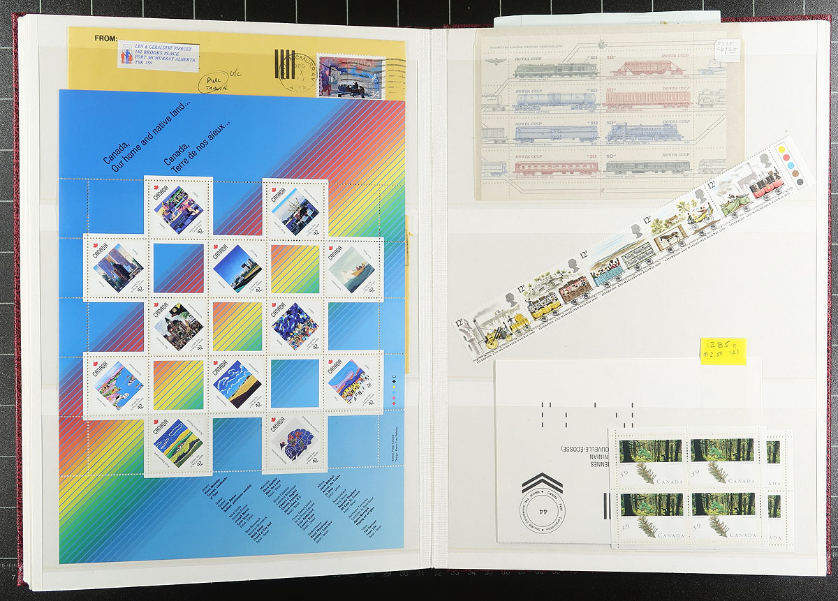 Mostly Modern Mint Holding, of primarily blocks / plate blocks, all arranged in a like-new 32-page KABE padded stockbook (retails for $50.00 alone). Also includes a smattering of FDC / Post Office Packs / Foreign Stamps. Conservatively valued for the usable Canadian face value / postage only. Total face value =