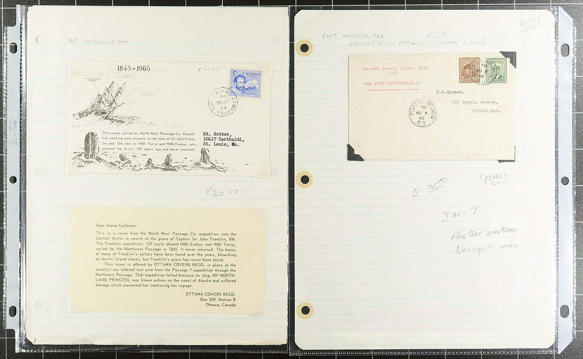 Northern / Eastern Arctic Mail. Lovely group of roughly 40 items from the Eastern Arctic Patrol, 1930's-1960's, containing mostly covers, along with a few post cards and photos, most on well described homemade pages. Many of the items were carried by the S.S. Nascopie, noting various ports of interest in the Northwest Territories including Graig Harbour, Fort Ross, Dundas Harbour, Port Burwell, Port Harrison, and much more. Almost of the covers have Canadian frankings but did spot a few foreign franked cover, along with a postage due and censored item. A lovely lot from this very interesting area of Canadian postal history. All items photographed online for your viewing pleasure. Should be well worth our estimate. Estimate =