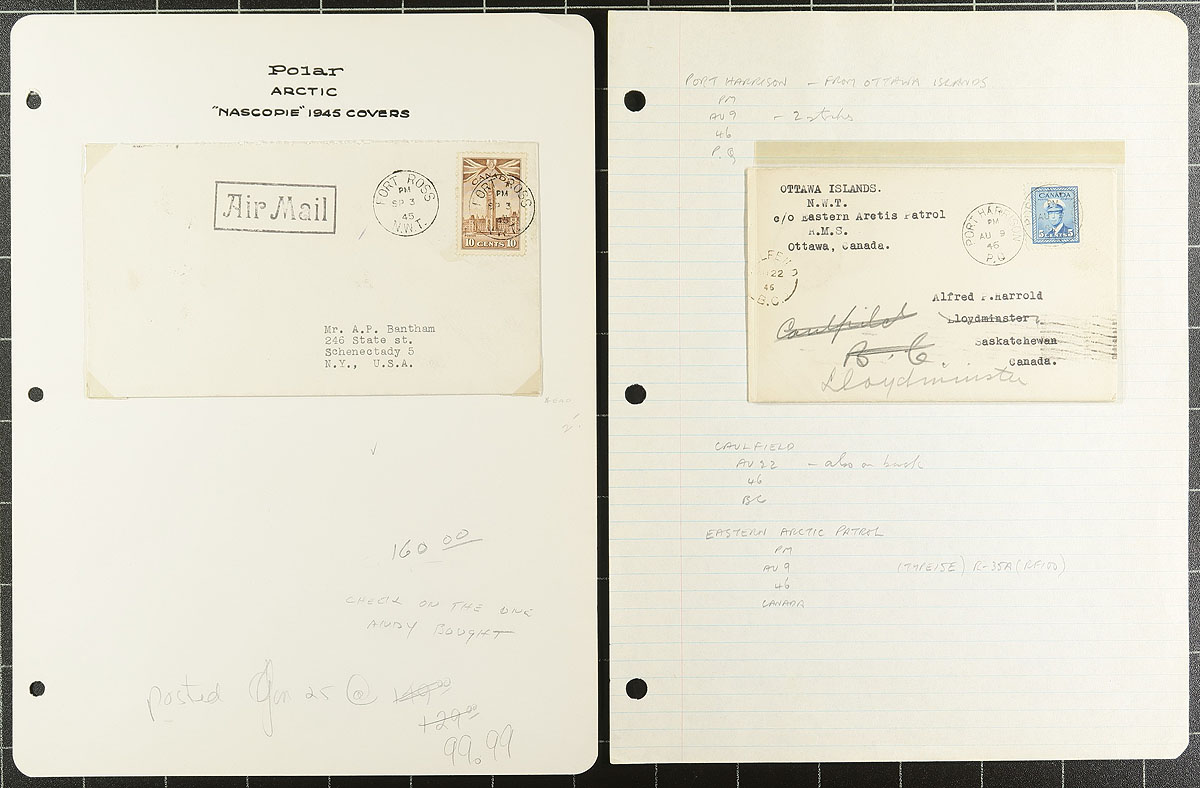 Northern / Eastern Arctic Mail. Lovely group of roughly 40 items from the Eastern Arctic Patrol, 1930's-1960's, containing mostly covers, along with a few post cards and photos, most on well described homemade pages. Many of the items were carried by the S.S. Nascopie, noting various ports of interest in the Northwest Territories including Graig Harbour, Fort Ross, Dundas Harbour, Port Burwell, Port Harrison, and much more. Almost of the covers have Canadian frankings but did spot a few foreign franked cover, along with a postage due and censored item. A lovely lot from this very interesting area of Canadian postal history. All items photographed online for your viewing pleasure. Should be well worth our estimate. Estimate =