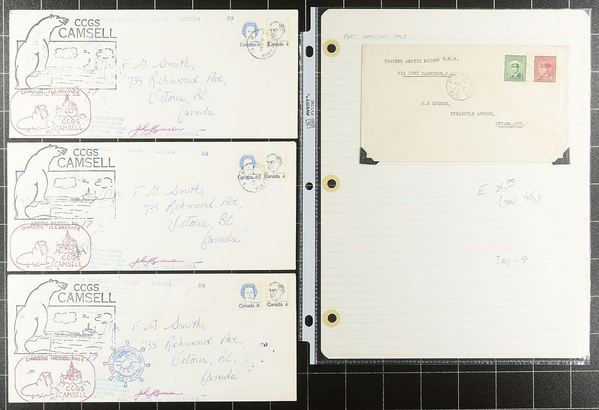 Northern / Eastern Arctic Mail. Lovely group of roughly 40 items from the Eastern Arctic Patrol, 1930's-1960's, containing mostly covers, along with a few post cards and photos, most on well described homemade pages. Many of the items were carried by the S.S. Nascopie, noting various ports of interest in the Northwest Territories including Graig Harbour, Fort Ross, Dundas Harbour, Port Burwell, Port Harrison, and much more. Almost of the covers have Canadian frankings but did spot a few foreign franked cover, along with a postage due and censored item. A lovely lot from this very interesting area of Canadian postal history. All items photographed online for your viewing pleasure. Should be well worth our estimate. Estimate =