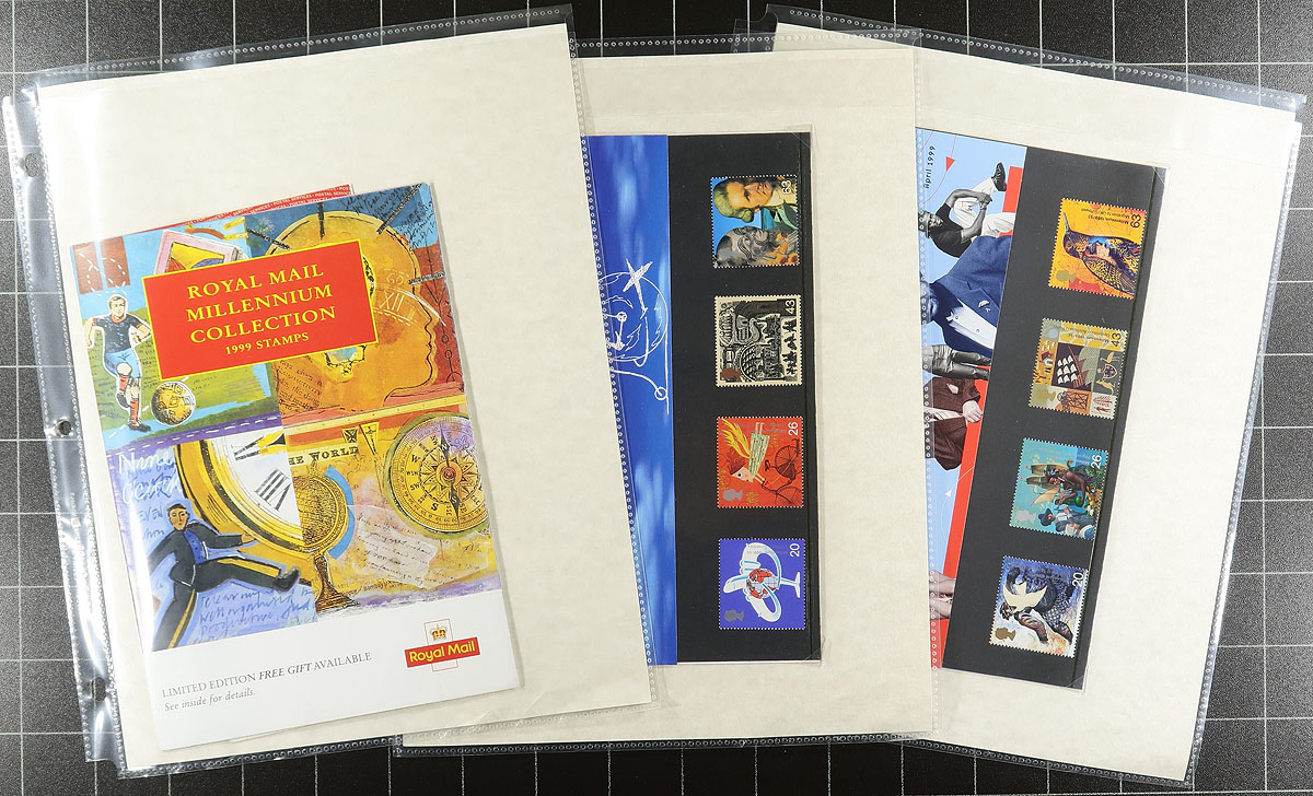 Lovely collection of Millennium issues, 1999-2001, containing a complete set of issues in presentation packs, and 12 first day covers from February 2000 to January 2001. The collection also includes the remaining first day covers from 2001. A neatly laid out collection on homemade pages, well organized in a binder. A collection that should be continued until complete. Clean and very fine. Estimate =