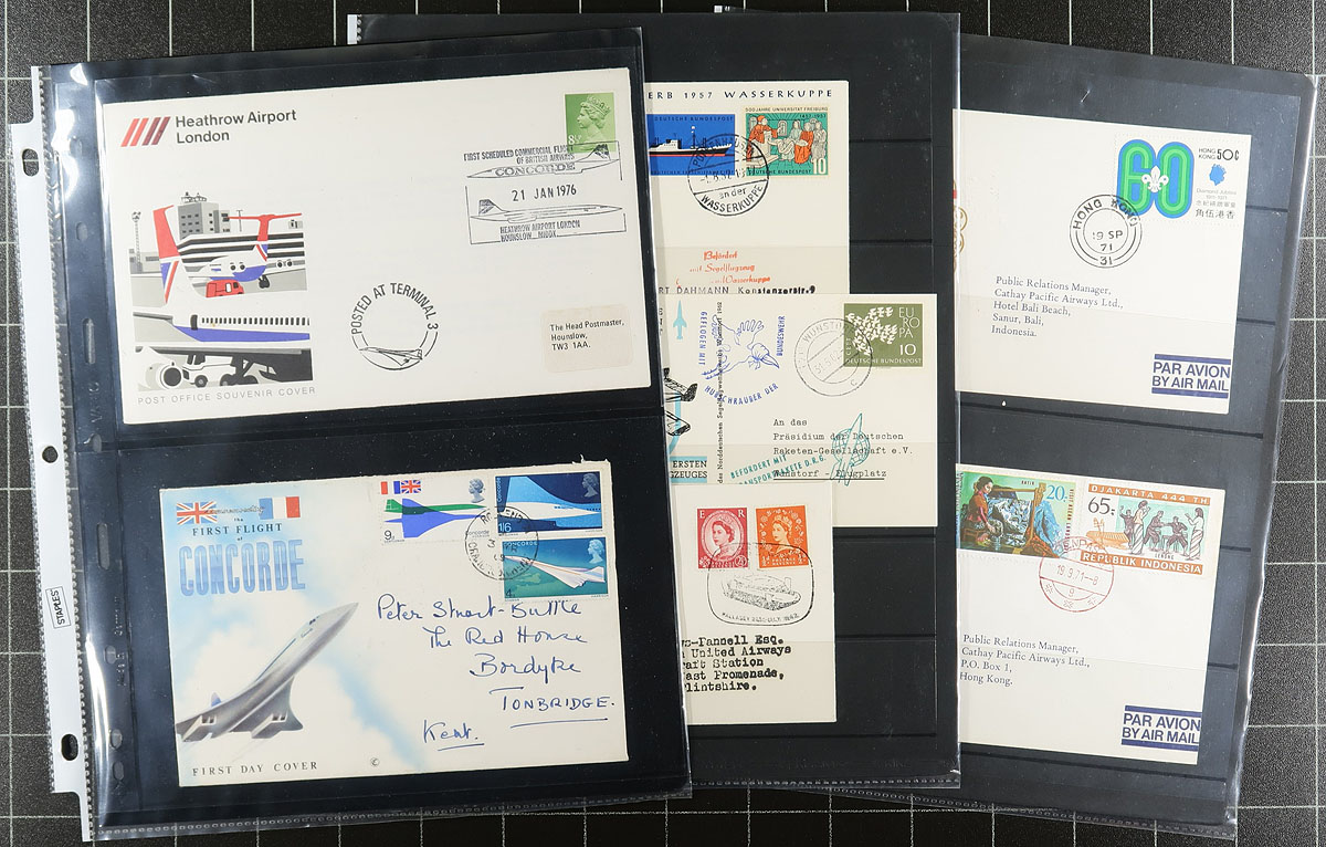 Airmail Extravaganza. Nice group of worldwide airmail covers, 1950's-1980's, containing 73 items neatly arranged in stock pages in a binder. The collection contains first flights, anniversary flights, and commemorative covers, noting mostly European and Asian routes, almost all from now defunct airlines. A nice lot for the airmail enthusiast and should be worth our low estimate of under $2 a cover. Clean and very fine. Estimate =
