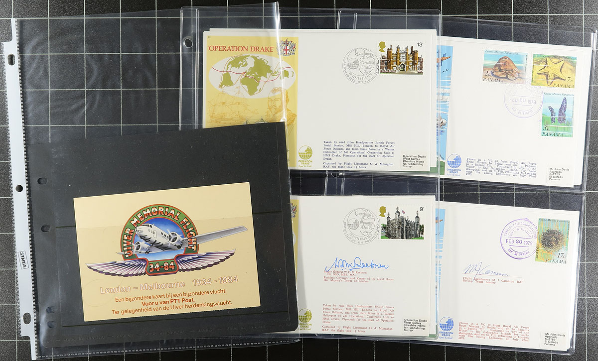 Airmail Extravaganza. Nice group of worldwide airmail covers, 1950's-1980's, containing 73 items neatly arranged in stock pages in a binder. The collection contains first flights, anniversary flights, and commemorative covers, noting mostly European and Asian routes, almost all from now defunct airlines. A nice lot for the airmail enthusiast and should be worth our low estimate of under $2 a cover. Clean and very fine. Estimate =