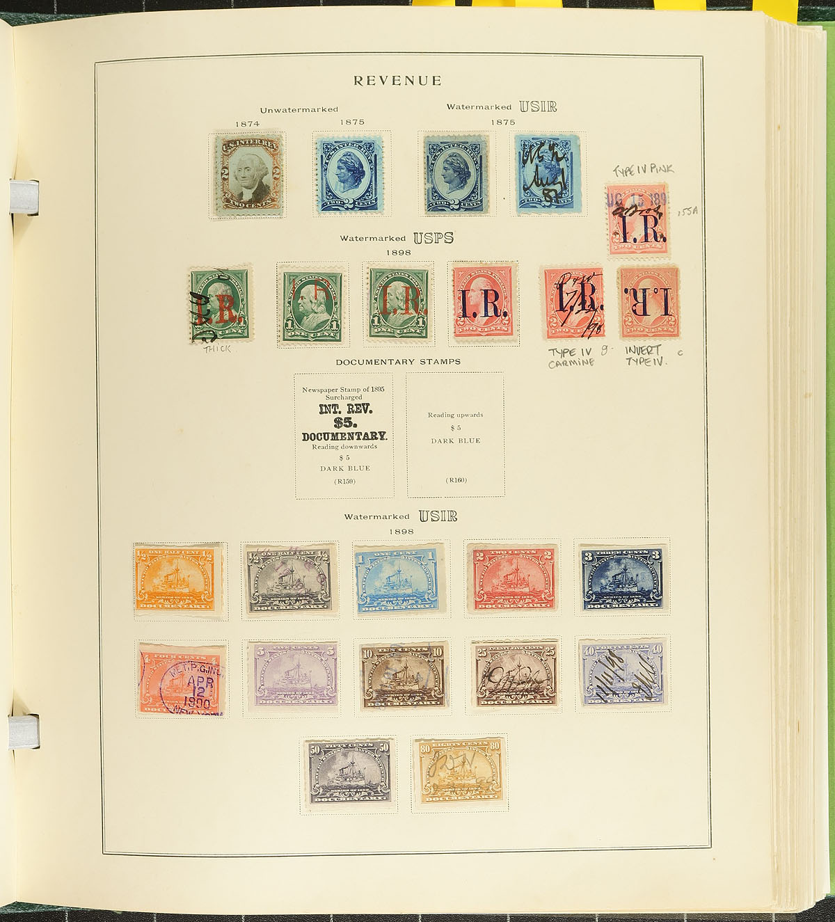 Extensive collection of mint and used United States revenues, containing many hundreds of stamps in a Scott Specialty album. We note a nice variety of revenue types including Telegraph (x54), Documentary (x332), Stock Transfer (x169), along with many other interesting types including Playing Cards, Silver Tax, and more. The lot also includes Hunting Permit stamps (complete from 1934 to 1953, Scott c.v. $946 total), Postal Note (set of 18, plus 90c +3c used on document), and a few Confederate stamps. A nice intermediate collection of these very interesting issues, and should be continued, especially in this album, overall fine to very fine. Online photos show a sampling. Estimate =