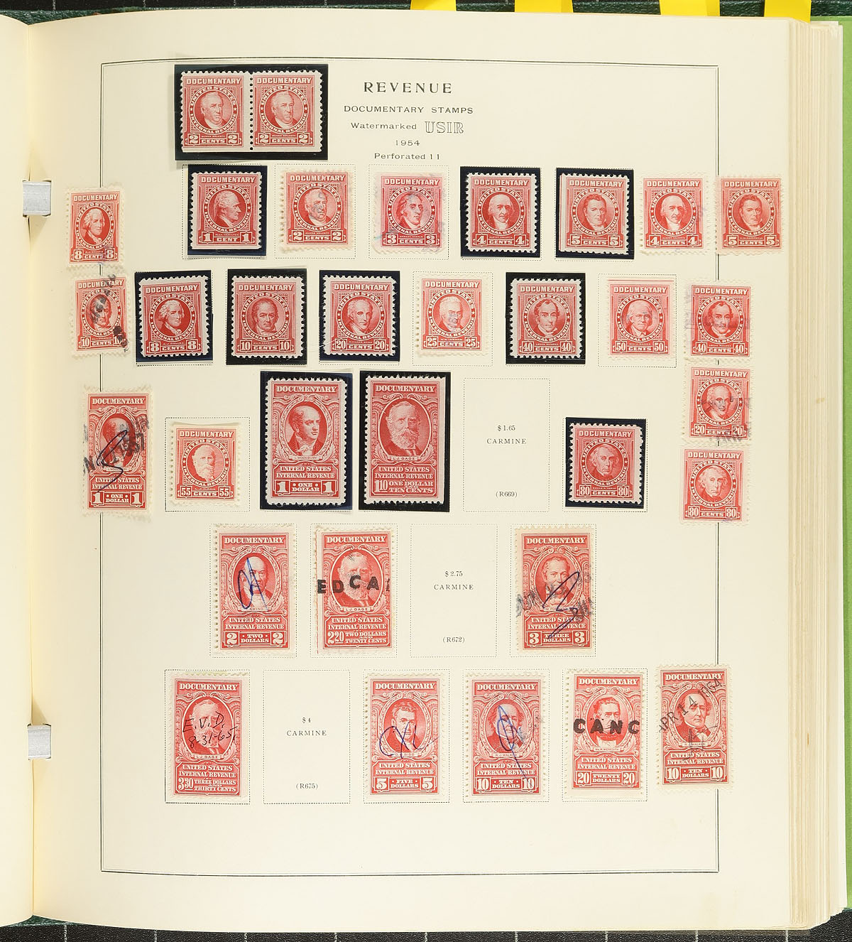 Extensive collection of mint and used United States revenues, containing many hundreds of stamps in a Scott Specialty album. We note a nice variety of revenue types including Telegraph (x54), Documentary (x332), Stock Transfer (x169), along with many other interesting types including Playing Cards, Silver Tax, and more. The lot also includes Hunting Permit stamps (complete from 1934 to 1953, Scott c.v. $946 total), Postal Note (set of 18, plus 90c +3c used on document), and a few Confederate stamps. A nice intermediate collection of these very interesting issues, and should be continued, especially in this album, overall fine to very fine. Online photos show a sampling. Estimate =