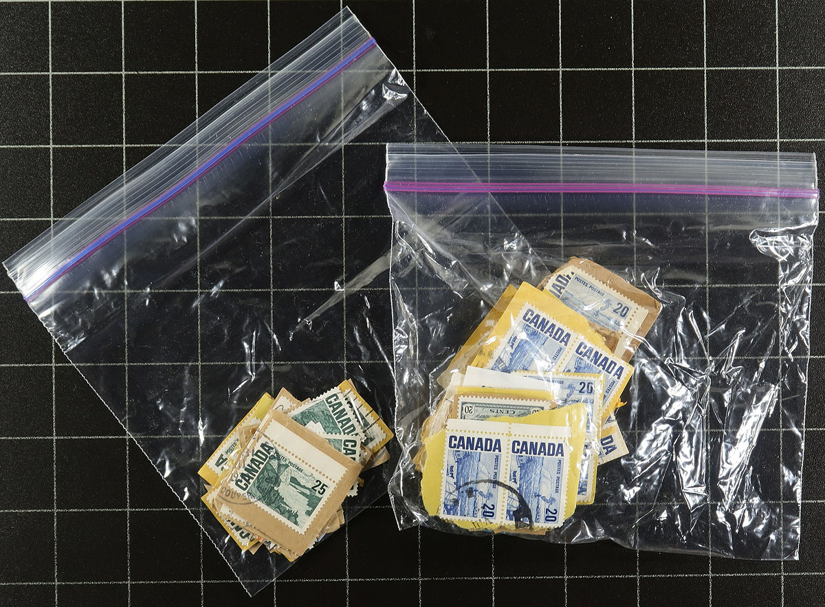 QEII Centennials. Hoard of used low denomination Centennials filling a bankers box. The lot contains several thousands of stamps, essentially in 3 parts. The first contains a few thousands of stamps organized into several envelopes (primarily 6c to 8c issues), the second part contains roughly 750 covers paying the 8c domestic rate generally from 1972 (country wide payments to Imperial Oil), and the third part contains many thousands of loose stamps on piece at the bottom of the box. Ideal for the Centennial specialist, completely unchecked for the various varieties these issues are known for. The lot appears to contain 1c to 8c only (did spot only a few 20c and 25c issues), overall fine to very fine. Estimate =