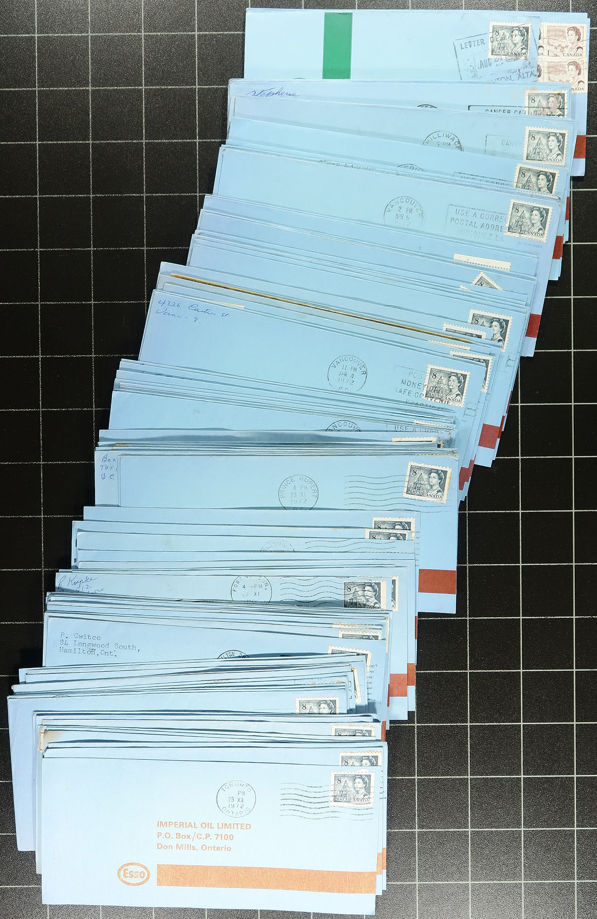 QEII Centennials. Hoard of used low denomination Centennials filling a bankers box. The lot contains several thousands of stamps, essentially in 3 parts. The first contains a few thousands of stamps organized into several envelopes (primarily 6c to 8c issues), the second part contains roughly 750 covers paying the 8c domestic rate generally from 1972 (country wide payments to Imperial Oil), and the third part contains many thousands of loose stamps on piece at the bottom of the box. Ideal for the Centennial specialist, completely unchecked for the various varieties these issues are known for. The lot appears to contain 1c to 8c only (did spot only a few 20c and 25c issues), overall fine to very fine. Estimate =