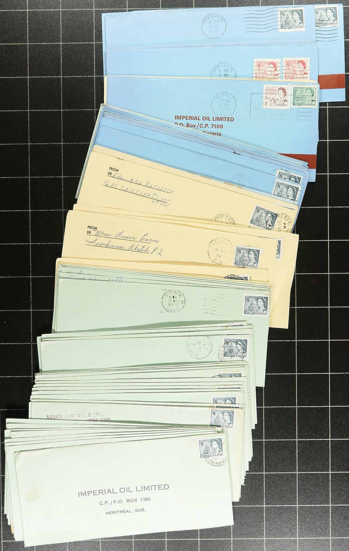 QEII Centennials. Hoard of used low denomination Centennials filling a bankers box. The lot contains several thousands of stamps, essentially in 3 parts. The first contains a few thousands of stamps organized into several envelopes (primarily 6c to 8c issues), the second part contains roughly 750 covers paying the 8c domestic rate generally from 1972 (country wide payments to Imperial Oil), and the third part contains many thousands of loose stamps on piece at the bottom of the box. Ideal for the Centennial specialist, completely unchecked for the various varieties these issues are known for. The lot appears to contain 1c to 8c only (did spot only a few 20c and 25c issues), overall fine to very fine. Estimate =