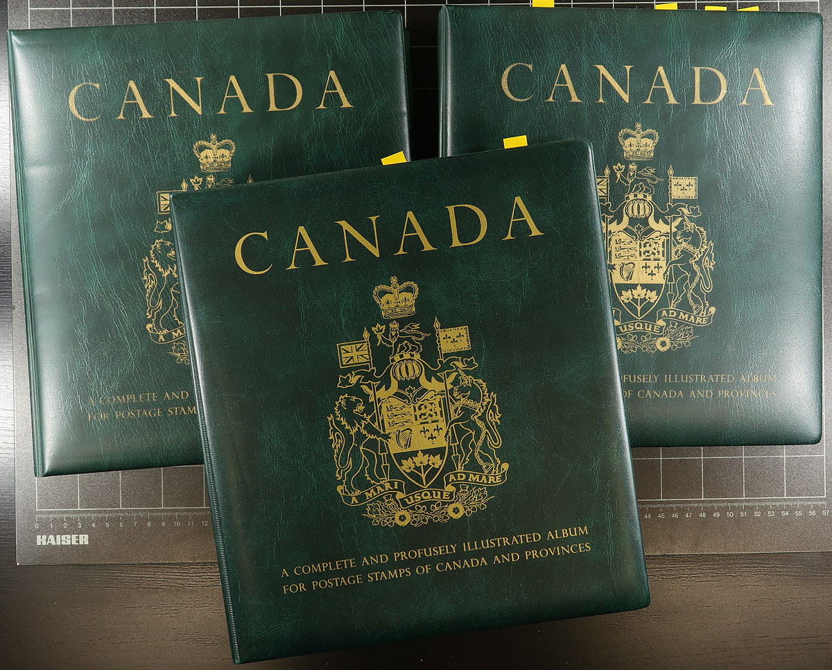Comprehensive never hinged collection of Canada, 1952-2002, containing over 1,000 stamps in many quadrille pages with hingeless mounts housed in 3 binders. This lovely collection appears to be complete in period ranging from Unitrade #316/1967, containing singles, blocks, souvenir sheets, coils, and booklet panes. The collection also includes additional items noting precancel warning strips, phosphor varieties, 17c Parliament varieties (including printed on the gum side), and more. A lovely collection that would have a high catalogue value, face value alone is just shy of $700.00 (counting 17c and up only). An ideal lot for collectors and dealers alike. Estimate =