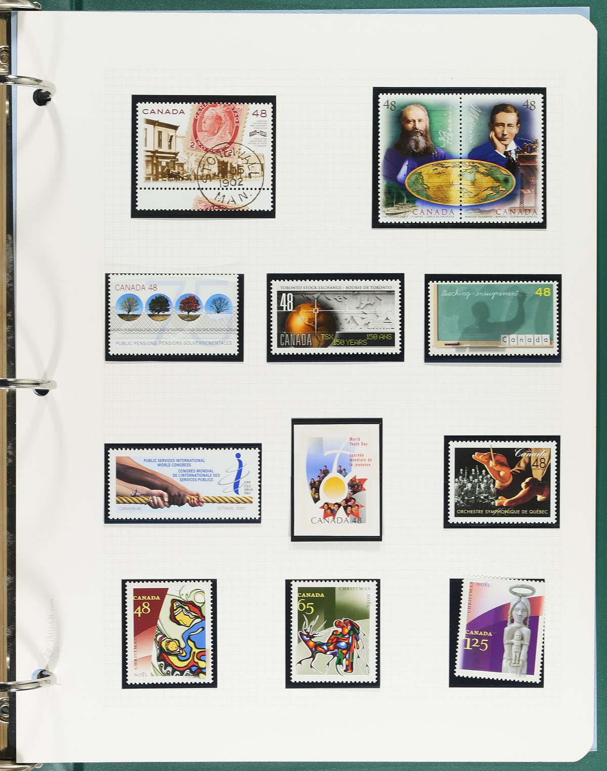 Comprehensive never hinged collection of Canada, 1952-2002, containing over 1,000 stamps in many quadrille pages with hingeless mounts housed in 3 binders. This lovely collection appears to be complete in period ranging from Unitrade #316/1967, containing singles, blocks, souvenir sheets, coils, and booklet panes. The collection also includes additional items noting precancel warning strips, phosphor varieties, 17c Parliament varieties (including printed on the gum side), and more. A lovely collection that would have a high catalogue value, face value alone is just shy of $700.00 (counting 17c and up only). An ideal lot for collectors and dealers alike. Estimate =