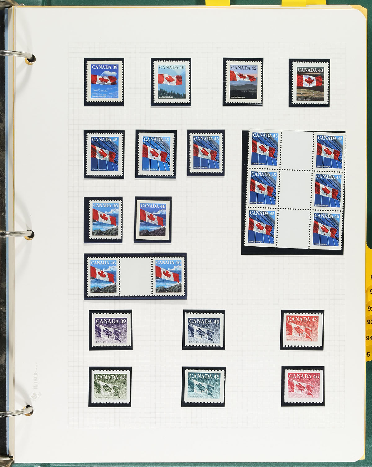 Comprehensive never hinged collection of Canada, 1952-2002, containing over 1,000 stamps in many quadrille pages with hingeless mounts housed in 3 binders. This lovely collection appears to be complete in period ranging from Unitrade #316/1967, containing singles, blocks, souvenir sheets, coils, and booklet panes. The collection also includes additional items noting precancel warning strips, phosphor varieties, 17c Parliament varieties (including printed on the gum side), and more. A lovely collection that would have a high catalogue value, face value alone is just shy of $700.00 (counting 17c and up only). An ideal lot for collectors and dealers alike. Estimate =