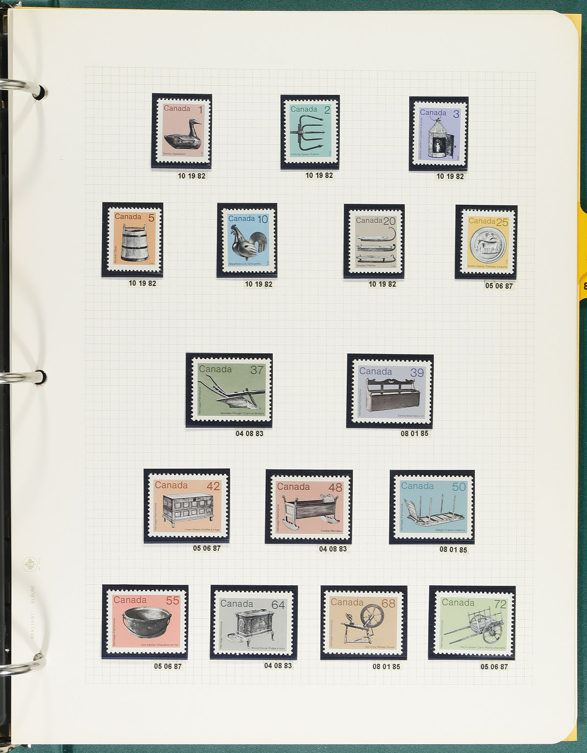 Comprehensive never hinged collection of Canada, 1952-2002, containing over 1,000 stamps in many quadrille pages with hingeless mounts housed in 3 binders. This lovely collection appears to be complete in period ranging from Unitrade #316/1967, containing singles, blocks, souvenir sheets, coils, and booklet panes. The collection also includes additional items noting precancel warning strips, phosphor varieties, 17c Parliament varieties (including printed on the gum side), and more. A lovely collection that would have a high catalogue value, face value alone is just shy of $700.00 (counting 17c and up only). An ideal lot for collectors and dealers alike. Estimate =