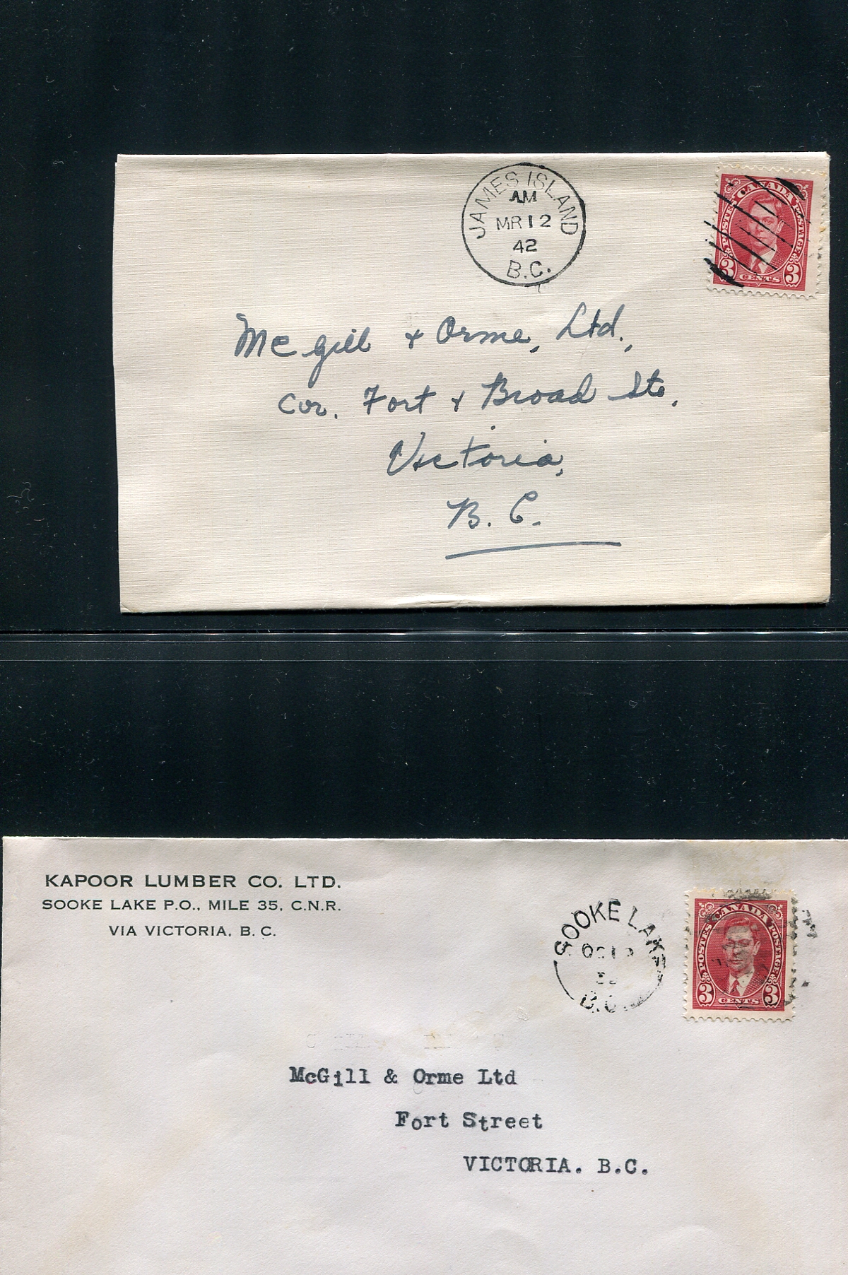 British Columbia. A duo of sought-after BC postmark covers, the first from James Island 1942 (CDS) cancel cover, the second from Sooke Lake 1939 (split ring) cancel cover. Both addressed to the McGill & Orme Drug Store in Victoria. The Sooke Lake cover is particularly interesting, with an attractive Kapoor Lumber business corner card. Estimate =