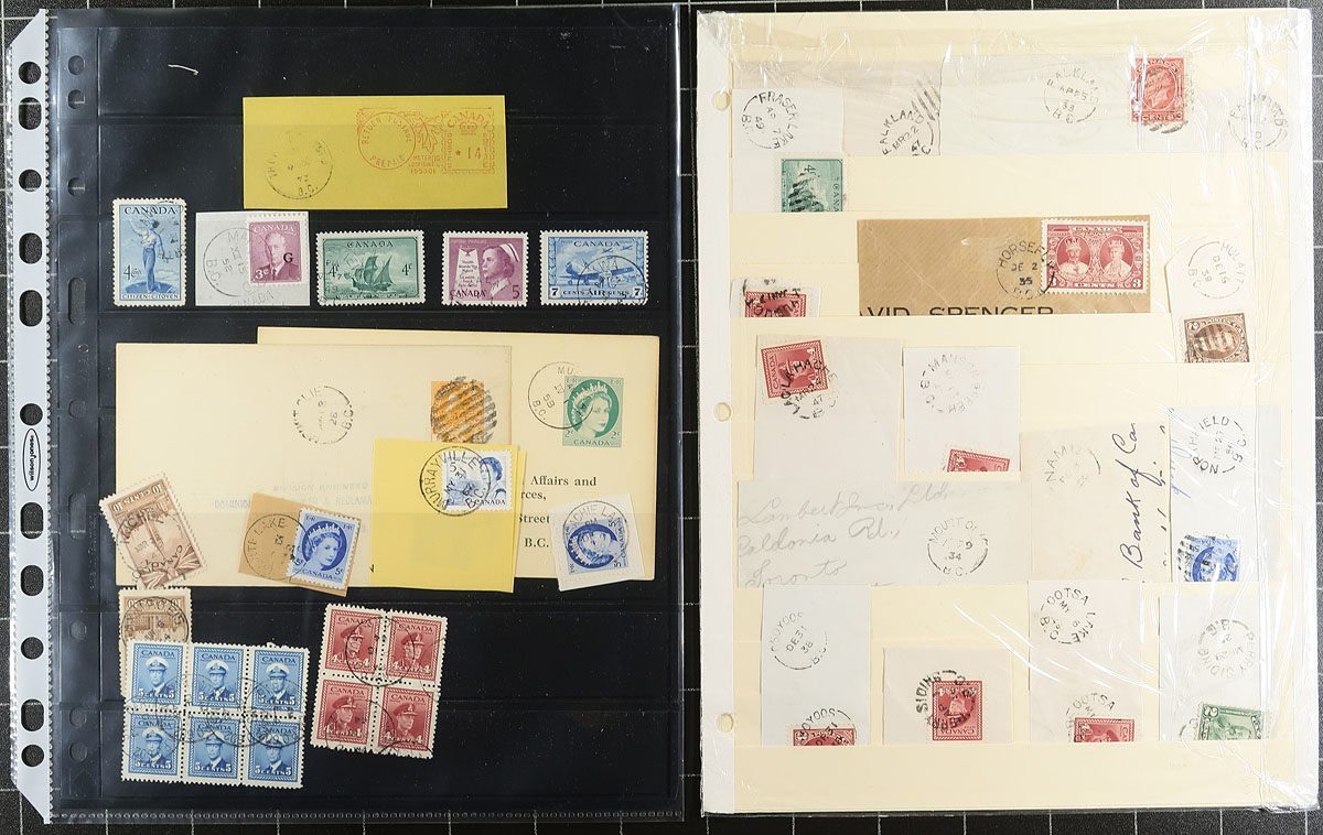 British Columbia Postal History. A hodgepodge of old auction lots acquired by the previous owner of the last decade or so, but not processed. Includes 38 covers and a few dozen cancels on stamp / piece. Several better offices noted such as Sicamous SUB Seymour Arm, Premier, Dundarave, Hazelmere, Ootsa Lake, Hulatt, Fraser Lake, Provincial Cannery etc. Estimate =