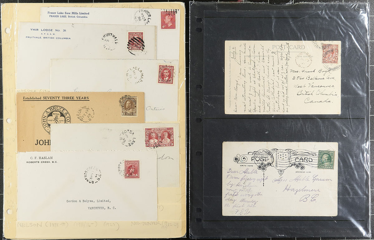 British Columbia Postal History. A hodgepodge of old auction lots acquired by the previous owner of the last decade or so, but not processed. Includes 38 covers and a few dozen cancels on stamp / piece. Several better offices noted such as Sicamous SUB Seymour Arm, Premier, Dundarave, Hazelmere, Ootsa Lake, Hulatt, Fraser Lake, Provincial Cannery etc. Estimate =