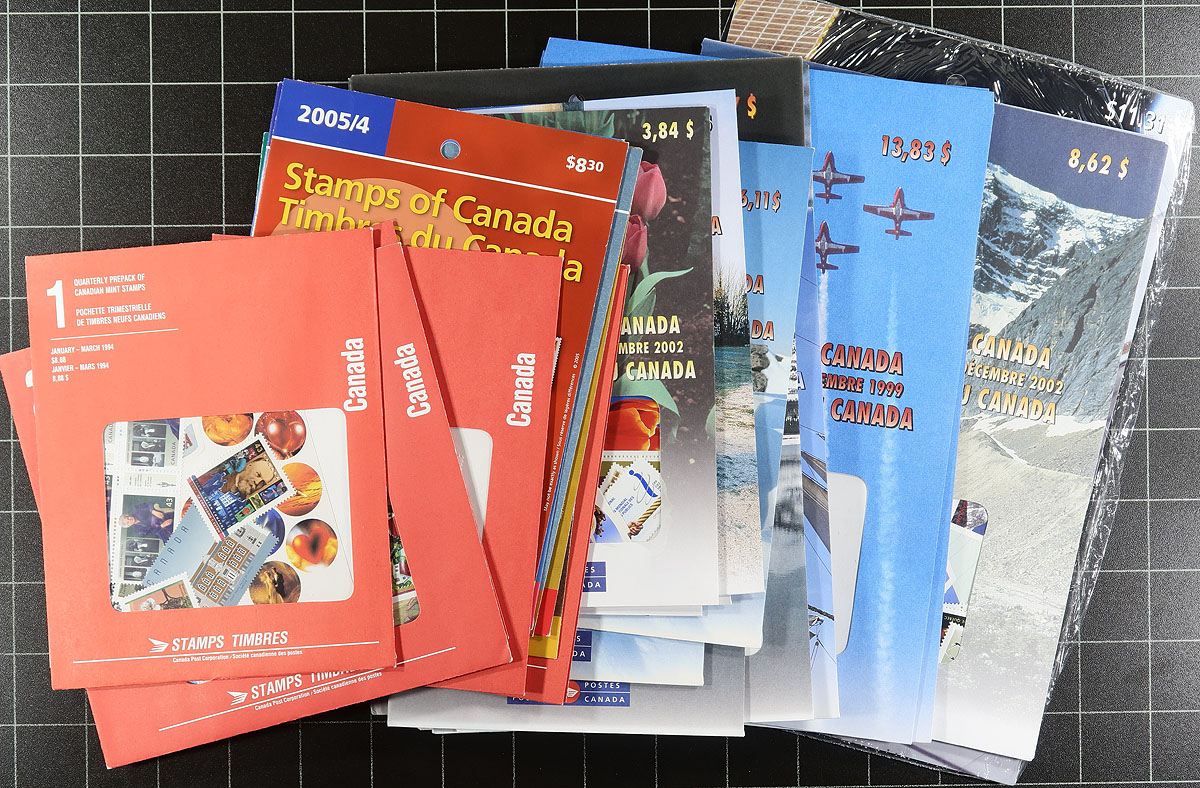 Quarterly Pack Potpourri. An "odds and ends" offering of 36 Post Office sealed Quarterly Packs ranging from 1993 to 2012 (with some duplicated). Includes many sought-after die cut singles as well as blocks and souvenir sheets. These are now listed in Unitrade but not yet priced, conservatively grouped / counted by the original purchase price, which is lower than what is actually enclosed in the pack due to the increase in value of the Permanent stamps. Original Canada Post cost =