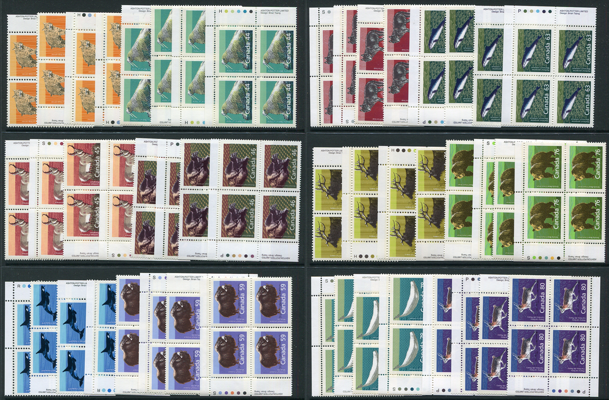 Complete set of VF mint Never Hinged matched-set inscription blocks for all the basic printings of the 1988-1990 Mammal definitive series. One of the most popular Canadian definitive stamp issues, for it's variety in printings / papers. Nice to get these regular issues all at once. Face value alone is $116.16. 2025-2026 Unitrade =