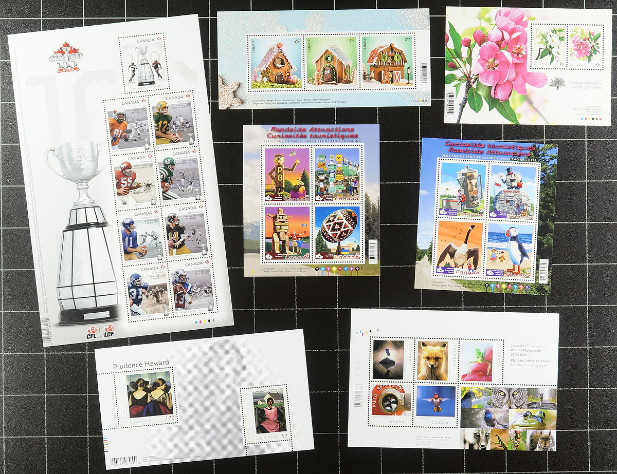 Modern Souvenir Sheets. A second offering of all-different (and all different from the first offering) modern souvenir sheets including many "P" and DOLLAR PLUS values. A total of 32 sheets, with issues for CFL, Remembrance Day, CAPEX, Lunar New Year, Maud Lewis, Gingerbread Houses etc. Conservatively value for the total face value alone (catalogue value would be at least double). Total face value =