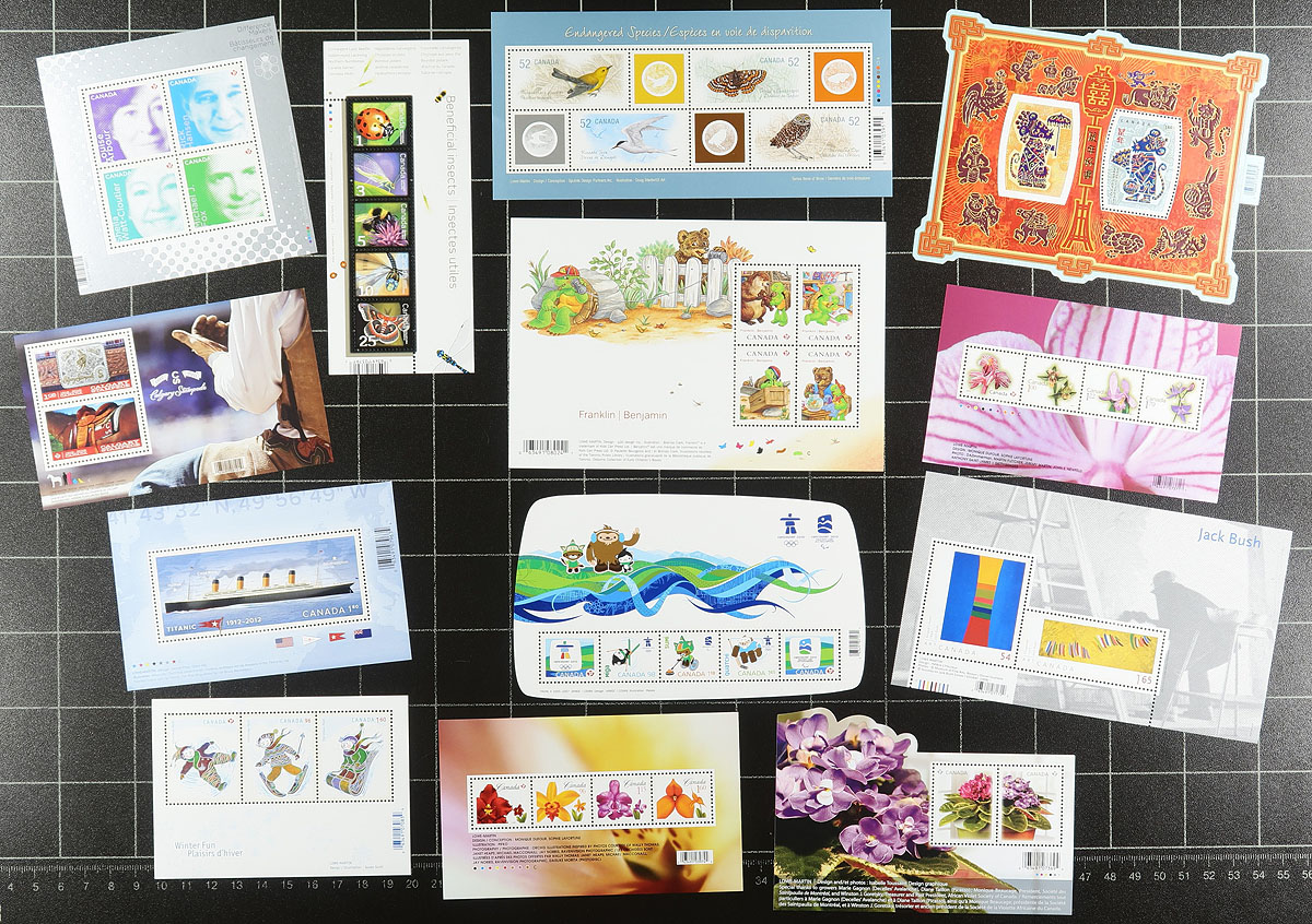 Modern Souvenir Sheets. A second offering of all-different (and all different from the first offering) modern souvenir sheets including many "P" and DOLLAR PLUS values. A total of 32 sheets, with issues for CFL, Remembrance Day, CAPEX, Lunar New Year, Maud Lewis, Gingerbread Houses etc. Conservatively value for the total face value alone (catalogue value would be at least double). Total face value =