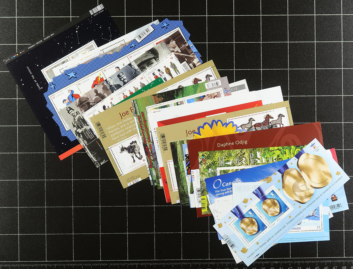 Modern Souvenir Sheets. An attractive holding of all-different modern souvenir sheets, including many "P" value stamps / mixed $1.00 PLUS values. A total of 40 sheets, including Superman, 2010 Olympics, Snow Mammals, Roadside Attractions, Joe Fafard etc. Conservatively value for the total face value alone (catalogue value would be at least double). Total face value =