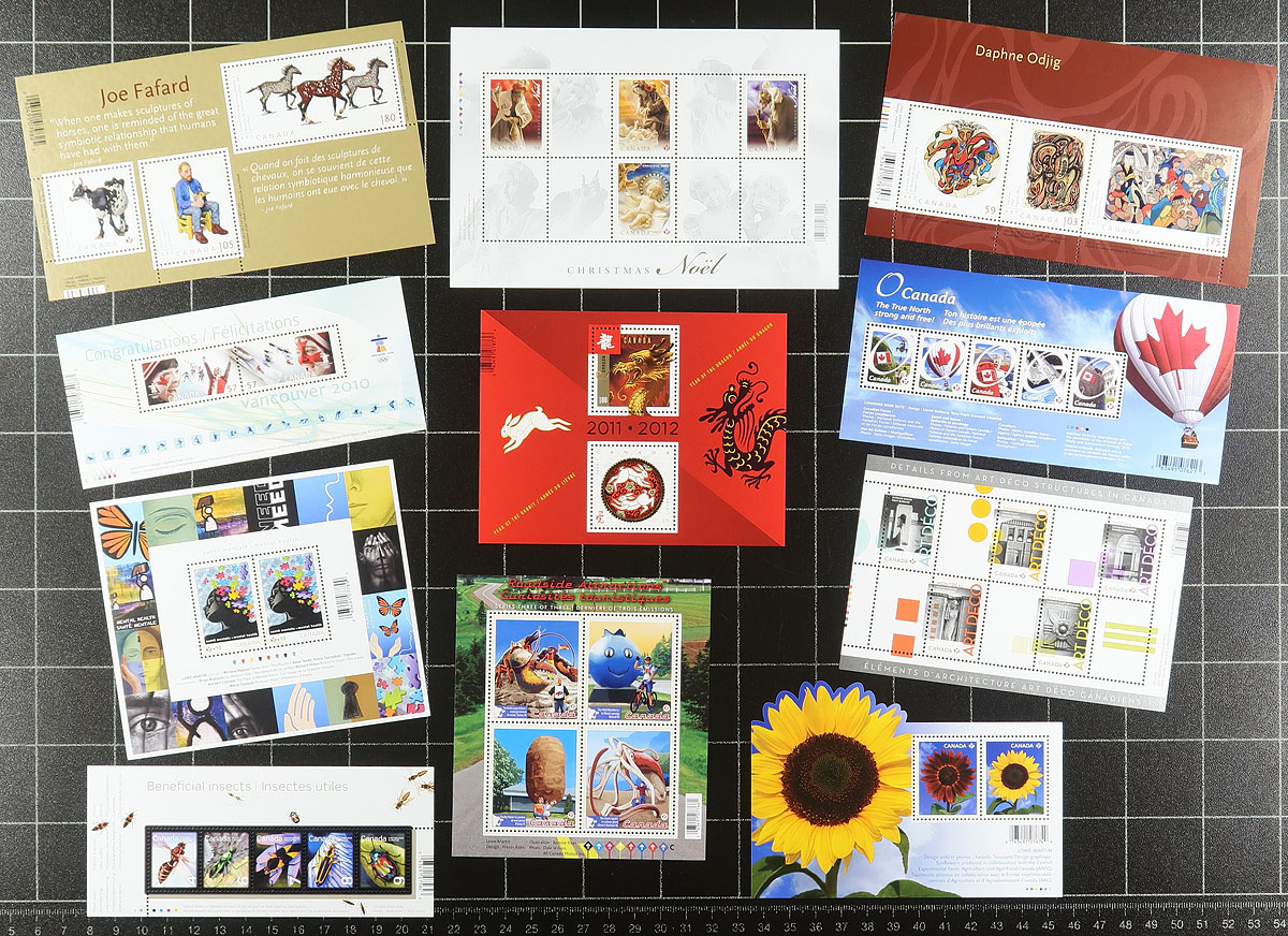 Modern Souvenir Sheets. An attractive holding of all-different modern souvenir sheets, including many "P" value stamps / mixed $1.00 PLUS values. A total of 40 sheets, including Superman, 2010 Olympics, Snow Mammals, Roadside Attractions, Joe Fafard etc. Conservatively value for the total face value alone (catalogue value would be at least double). Total face value =