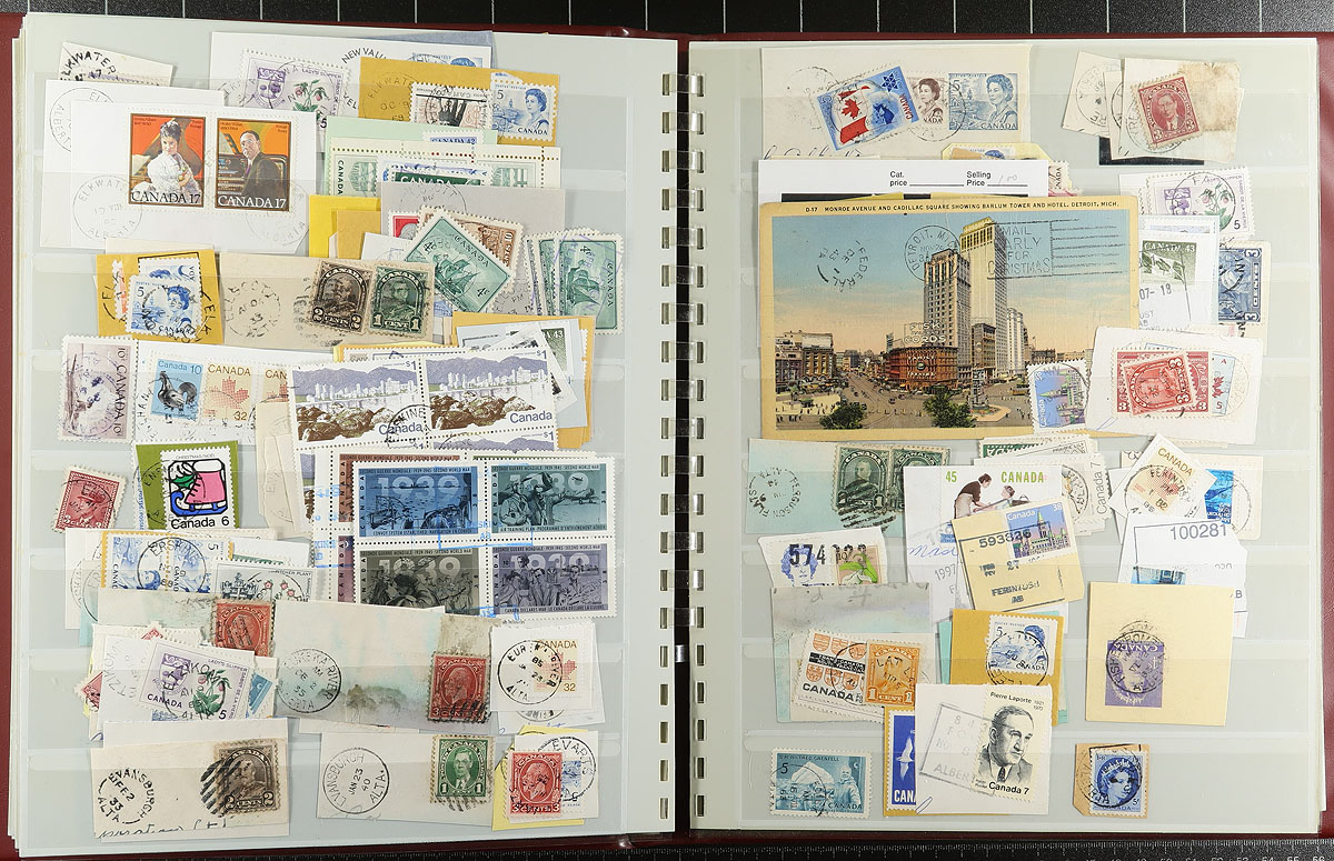 Large and comprehensive collection of Alberta town postmarks, a life-time work, 1900's-1980's, containing a few thousand stamps on piece stuffed into 2 SAFE stockbooks. The collection is well organized alphabetically containing several hundred different towns ranging from A to Y. Just a few of the towns encountered include Airdrie, Benton Station, Big Stone, Buffalo Lake, Knee Hill Valley, Niton Junction, Pendryl, Sarrail, Tiger Lily, and so much more. Postmark interest includes a wide range of cancels including cds, split ring, MOON, duplex, POCON types, and others, along with sub and rural post offices, with some towns having a variety of postmark types. A must have for the Alberta or Canada postmark collector, as this would be a very difficult collection to duplicate, with all pages photographed for your viewing pleasure, and well worth our estimate. Estimate =