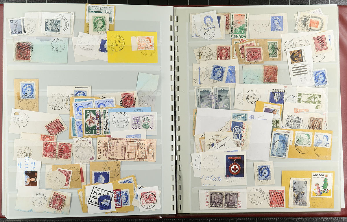 Large and comprehensive collection of Alberta town postmarks, a life-time work, 1900's-1980's, containing a few thousand stamps on piece stuffed into 2 SAFE stockbooks. The collection is well organized alphabetically containing several hundred different towns ranging from A to Y. Just a few of the towns encountered include Airdrie, Benton Station, Big Stone, Buffalo Lake, Knee Hill Valley, Niton Junction, Pendryl, Sarrail, Tiger Lily, and so much more. Postmark interest includes a wide range of cancels including cds, split ring, MOON, duplex, POCON types, and others, along with sub and rural post offices, with some towns having a variety of postmark types. A must have for the Alberta or Canada postmark collector, as this would be a very difficult collection to duplicate, with all pages photographed for your viewing pleasure, and well worth our estimate. Estimate =