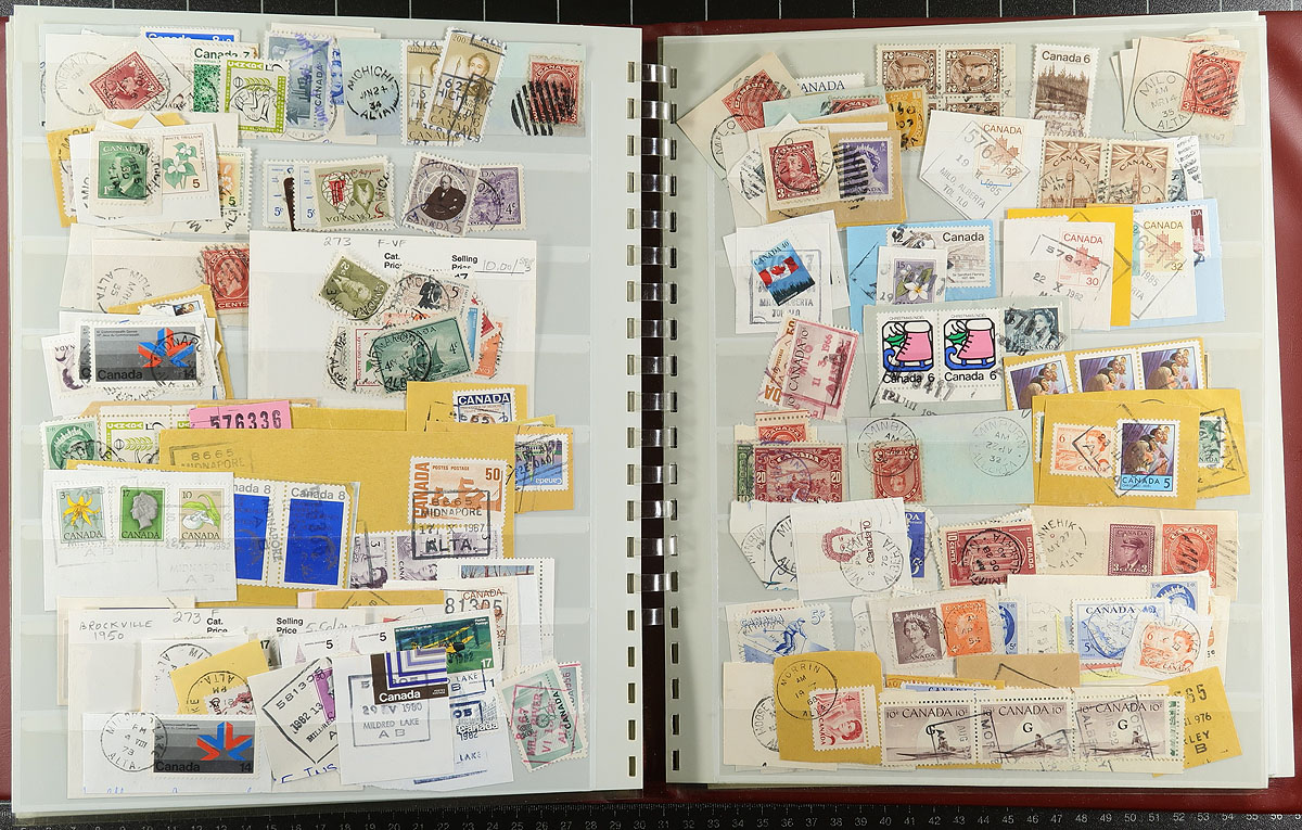 Large and comprehensive collection of Alberta town postmarks, a life-time work, 1900's-1980's, containing a few thousand stamps on piece stuffed into 2 SAFE stockbooks. The collection is well organized alphabetically containing several hundred different towns ranging from A to Y. Just a few of the towns encountered include Airdrie, Benton Station, Big Stone, Buffalo Lake, Knee Hill Valley, Niton Junction, Pendryl, Sarrail, Tiger Lily, and so much more. Postmark interest includes a wide range of cancels including cds, split ring, MOON, duplex, POCON types, and others, along with sub and rural post offices, with some towns having a variety of postmark types. A must have for the Alberta or Canada postmark collector, as this would be a very difficult collection to duplicate, with all pages photographed for your viewing pleasure, and well worth our estimate. Estimate =