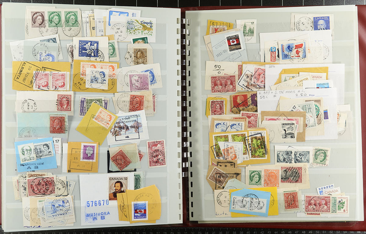 Large and comprehensive collection of Alberta town postmarks, a life-time work, 1900's-1980's, containing a few thousand stamps on piece stuffed into 2 SAFE stockbooks. The collection is well organized alphabetically containing several hundred different towns ranging from A to Y. Just a few of the towns encountered include Airdrie, Benton Station, Big Stone, Buffalo Lake, Knee Hill Valley, Niton Junction, Pendryl, Sarrail, Tiger Lily, and so much more. Postmark interest includes a wide range of cancels including cds, split ring, MOON, duplex, POCON types, and others, along with sub and rural post offices, with some towns having a variety of postmark types. A must have for the Alberta or Canada postmark collector, as this would be a very difficult collection to duplicate, with all pages photographed for your viewing pleasure, and well worth our estimate. Estimate =
