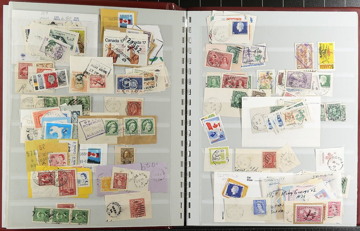 Large and comprehensive collection of Alberta town postmarks, a life-time work, 1900's-1980's, containing a few thousand stamps on piece stuffed into 2 SAFE stockbooks. The collection is well organized alphabetically containing several hundred different towns ranging from A to Y. Just a few of the towns encountered include Airdrie, Benton Station, Big Stone, Buffalo Lake, Knee Hill Valley, Niton Junction, Pendryl, Sarrail, Tiger Lily, and so much more. Postmark interest includes a wide range of cancels including cds, split ring, MOON, duplex, POCON types, and others, along with sub and rural post offices, with some towns having a variety of postmark types. A must have for the Alberta or Canada postmark collector, as this would be a very difficult collection to duplicate, with all pages photographed for your viewing pleasure, and well worth our estimate. Estimate =