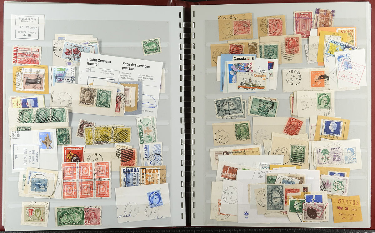 Large and comprehensive collection of Alberta town postmarks, a life-time work, 1900's-1980's, containing a few thousand stamps on piece stuffed into 2 SAFE stockbooks. The collection is well organized alphabetically containing several hundred different towns ranging from A to Y. Just a few of the towns encountered include Airdrie, Benton Station, Big Stone, Buffalo Lake, Knee Hill Valley, Niton Junction, Pendryl, Sarrail, Tiger Lily, and so much more. Postmark interest includes a wide range of cancels including cds, split ring, MOON, duplex, POCON types, and others, along with sub and rural post offices, with some towns having a variety of postmark types. A must have for the Alberta or Canada postmark collector, as this would be a very difficult collection to duplicate, with all pages photographed for your viewing pleasure, and well worth our estimate. Estimate =