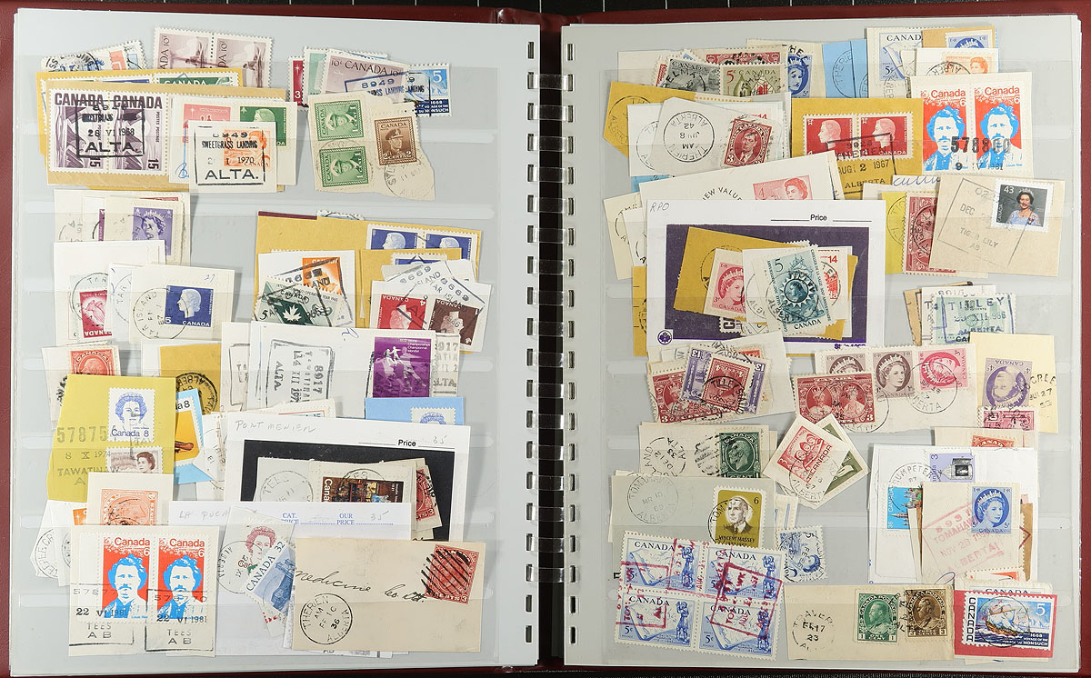 Large and comprehensive collection of Alberta town postmarks, a life-time work, 1900's-1980's, containing a few thousand stamps on piece stuffed into 2 SAFE stockbooks. The collection is well organized alphabetically containing several hundred different towns ranging from A to Y. Just a few of the towns encountered include Airdrie, Benton Station, Big Stone, Buffalo Lake, Knee Hill Valley, Niton Junction, Pendryl, Sarrail, Tiger Lily, and so much more. Postmark interest includes a wide range of cancels including cds, split ring, MOON, duplex, POCON types, and others, along with sub and rural post offices, with some towns having a variety of postmark types. A must have for the Alberta or Canada postmark collector, as this would be a very difficult collection to duplicate, with all pages photographed for your viewing pleasure, and well worth our estimate. Estimate =