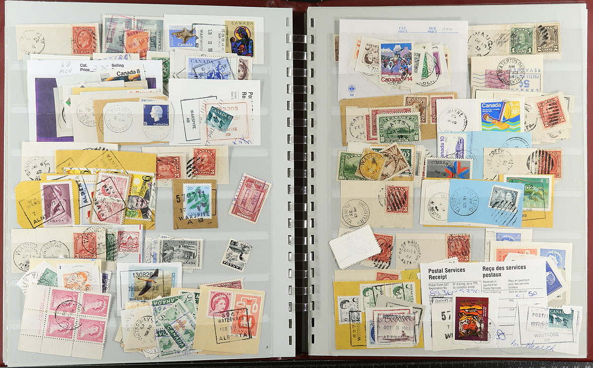 Large and comprehensive collection of Alberta town postmarks, a life-time work, 1900's-1980's, containing a few thousand stamps on piece stuffed into 2 SAFE stockbooks. The collection is well organized alphabetically containing several hundred different towns ranging from A to Y. Just a few of the towns encountered include Airdrie, Benton Station, Big Stone, Buffalo Lake, Knee Hill Valley, Niton Junction, Pendryl, Sarrail, Tiger Lily, and so much more. Postmark interest includes a wide range of cancels including cds, split ring, MOON, duplex, POCON types, and others, along with sub and rural post offices, with some towns having a variety of postmark types. A must have for the Alberta or Canada postmark collector, as this would be a very difficult collection to duplicate, with all pages photographed for your viewing pleasure, and well worth our estimate. Estimate =