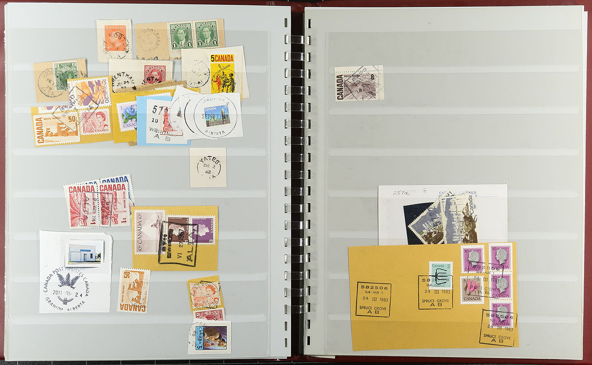 Large and comprehensive collection of Alberta town postmarks, a life-time work, 1900's-1980's, containing a few thousand stamps on piece stuffed into 2 SAFE stockbooks. The collection is well organized alphabetically containing several hundred different towns ranging from A to Y. Just a few of the towns encountered include Airdrie, Benton Station, Big Stone, Buffalo Lake, Knee Hill Valley, Niton Junction, Pendryl, Sarrail, Tiger Lily, and so much more. Postmark interest includes a wide range of cancels including cds, split ring, MOON, duplex, POCON types, and others, along with sub and rural post offices, with some towns having a variety of postmark types. A must have for the Alberta or Canada postmark collector, as this would be a very difficult collection to duplicate, with all pages photographed for your viewing pleasure, and well worth our estimate. Estimate =