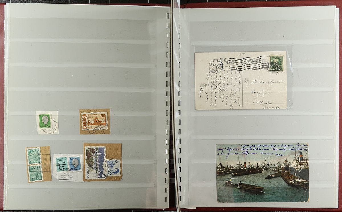 Large and comprehensive collection of Alberta town postmarks, a life-time work, 1900's-1980's, containing a few thousand stamps on piece stuffed into 2 SAFE stockbooks. The collection is well organized alphabetically containing several hundred different towns ranging from A to Y. Just a few of the towns encountered include Airdrie, Benton Station, Big Stone, Buffalo Lake, Knee Hill Valley, Niton Junction, Pendryl, Sarrail, Tiger Lily, and so much more. Postmark interest includes a wide range of cancels including cds, split ring, MOON, duplex, POCON types, and others, along with sub and rural post offices, with some towns having a variety of postmark types. A must have for the Alberta or Canada postmark collector, as this would be a very difficult collection to duplicate, with all pages photographed for your viewing pleasure, and well worth our estimate. Estimate =