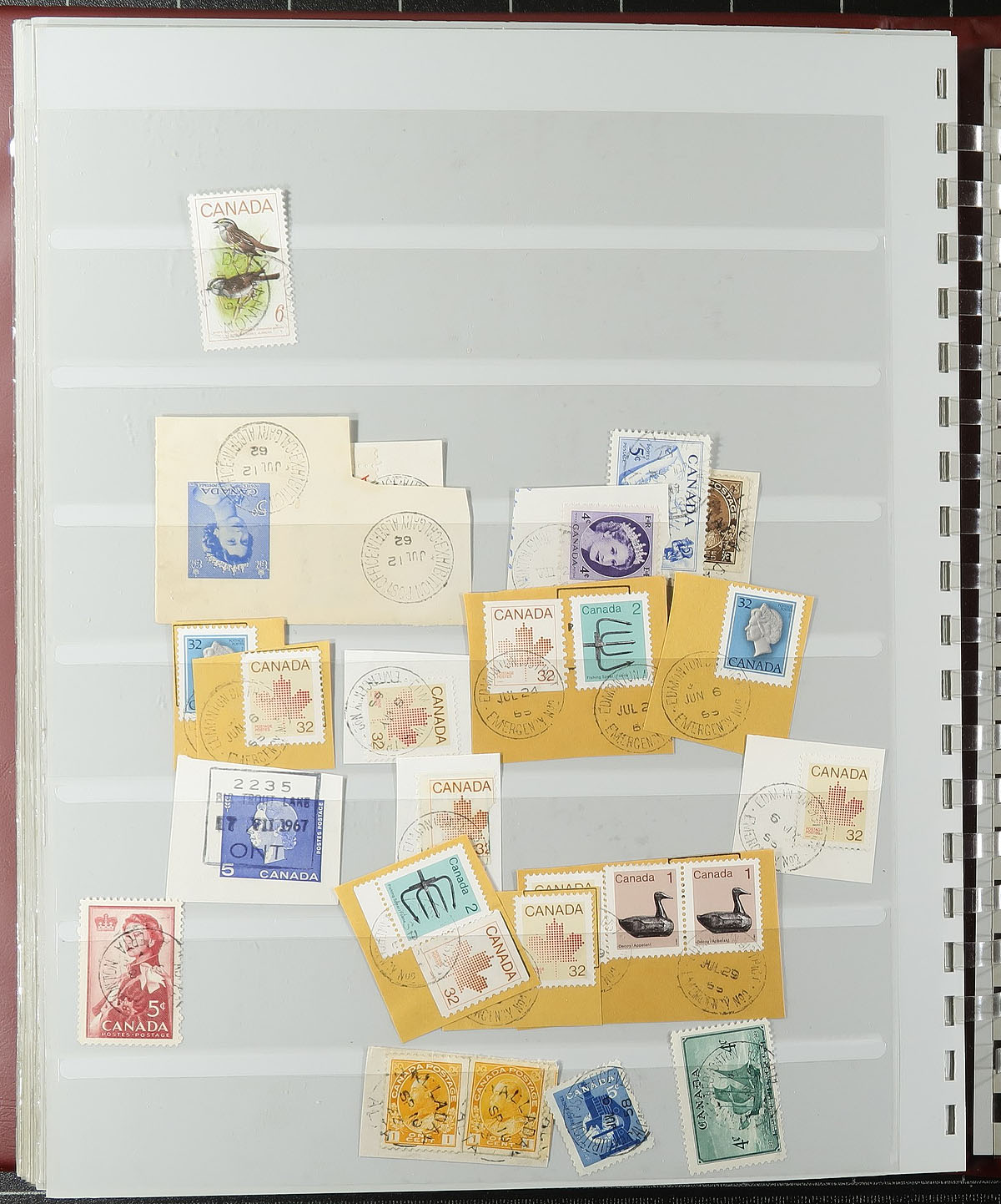 Large and comprehensive collection of Alberta town postmarks, a life-time work, 1900's-1980's, containing a few thousand stamps on piece stuffed into 2 SAFE stockbooks. The collection is well organized alphabetically containing several hundred different towns ranging from A to Y. Just a few of the towns encountered include Airdrie, Benton Station, Big Stone, Buffalo Lake, Knee Hill Valley, Niton Junction, Pendryl, Sarrail, Tiger Lily, and so much more. Postmark interest includes a wide range of cancels including cds, split ring, MOON, duplex, POCON types, and others, along with sub and rural post offices, with some towns having a variety of postmark types. A must have for the Alberta or Canada postmark collector, as this would be a very difficult collection to duplicate, with all pages photographed for your viewing pleasure, and well worth our estimate. Estimate =