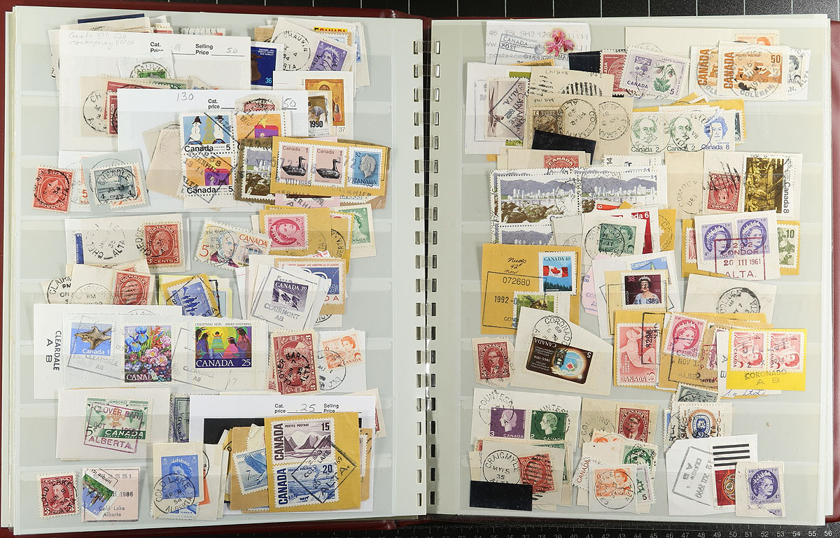 Large and comprehensive collection of Alberta town postmarks, a life-time work, 1900's-1980's, containing a few thousand stamps on piece stuffed into 2 SAFE stockbooks. The collection is well organized alphabetically containing several hundred different towns ranging from A to Y. Just a few of the towns encountered include Airdrie, Benton Station, Big Stone, Buffalo Lake, Knee Hill Valley, Niton Junction, Pendryl, Sarrail, Tiger Lily, and so much more. Postmark interest includes a wide range of cancels including cds, split ring, MOON, duplex, POCON types, and others, along with sub and rural post offices, with some towns having a variety of postmark types. A must have for the Alberta or Canada postmark collector, as this would be a very difficult collection to duplicate, with all pages photographed for your viewing pleasure, and well worth our estimate. Estimate =